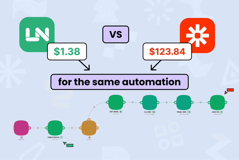 Latenode never bills you for each action in your workflow, unlike Zapier. Therefore, when the volume of operations reaches hundreds or thousands, Latenode becomes up to 89.7 times cheaper.